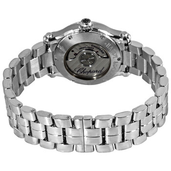 Stainless steel case with a stainless steel bracelet. Fixed stainless steel bezel set with 44 diamonds. Silver guilloche center dial (featuring five floating diamonds) with silver-tone hands and index hour markers. Roman numerals appear at the 3, 6, 9 and 12 o'clock positions. Minute markers around the outer rim. Dial Type: Analog. Automatic movement. Scratch resistant sapphire crystal. Transparent case back. Round case shape. Case size: 30 mm. Water resistant at 30 meters / 100 feet. Functions: hour, minute, second. Happy Sport Series. Luxury watch style. Watch label: Swiss Made. Chopard Happy Sport Automatic Diamond Silver Dial Ladies Watch 278573-3014.