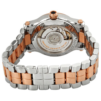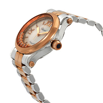 Stainless steel case with a stainless steel bracelet with 18k rose gold center links. Fixed 18k rose gold bezel. Mother of pearl dial (with seven floating diamonds) with rose gold-tone hands and index hour markers. Roman numerals appear at the 3, 6, 9 and 12 hour positions. Minute markers around the outer rim. Dial Type: Analog. Date display between the 4 and 5 o'clock positions. Sellita SW 300-1 automatic movement with a 42-hour power reserve. Scratch resistant sapphire crystal. Pull / push crown. Transparent case back. Round case shape. Cse size: 36 mm. Case thickness: 12.30 mm. Hidden fold over clasp. Water resistant at 30 meters / 100 feet. Functions: date, hour, minute, second. Happy Sport Series. Dress watch style. Watch label: Swiss Made. Chopard Happy Sport Automatic Mother of Pearl Dial Ladies Watch 278559-6009.