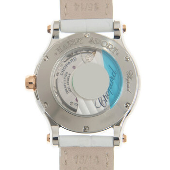 Stainless steel case with a white alligator leather strap. Fixed gold-tone 18kt rose gold bezel. Silver-tone dial with index hour markers. Roman numerals mark the 3, 6, 9 and 12 o'clock positions, minute markers around the outer rim. Dial Type: Analog. Sellita Calibre SW 300-1 Automatic movement, based upon Sellita SW 300, containing 25 Jewels, bitting at 28800 vph, and has a power reserve of approximately 38 hours. Scratch resistant sapphire crystal. Pull / push crown. Transparent case back. Round case shape, case size: 30 mm. Tang clasp. Water resistant at 30 meters / 100 feet. Functions: hour, minute, second. Additional Info: five floating diamonds on dial. Happy Sport Series. Luxury watch style. Watch label: Swiss Made. Chopard Happy Sport Automatic Silver Dial Ladies Watch 278573 6028.