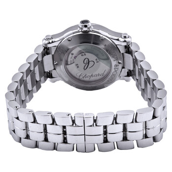 Stainless steel case with a silver-tone stainless steel bracelet. Fixed stainless steel bezel. Silver dial (with five floating diamonds) with silver-tone hands and index hour markers. Roman numerals mark the 3, 6, 9 and 12 o'clock positions. Minute markers around the outer rim. Dial Type: Analog. Chopard calibre 09.01-C automatic movement, containing 27 Jewels, bitting at 25200 vph, and has a power reserve of approximately 42 hours. Scratch resistant sapphire crystal. Pull / push crown. Transparent case back. Round case shape. Case size: 30 mm. Fold over clasp. Water resistant at 30 meters / 100 feet. Functions: hour, minute, second. Luxury watch style. Watch label: Swiss Made. Chopard Happy Sport Automatic Silver Dial Ladies Watch 278573-3012.