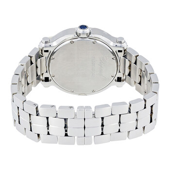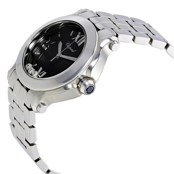 Stainless steel case with a stainless steel bracelet. Fixed stainless steel bezel. Black dial (with three floating diamonds) with silver-tone hands and index hour markers. Roman numerals mark the 3, 6, 9 and 12 o'clock positions. Dial Type: Analog. Date display between the 4 and 5 o'clock positions. Quartz movement. Scratch resistant sapphire crystal. Solid case back. Case size: 36 mm. Case thickness: 11 mm. Round case shape. Band width: 18 mm. Hidden fold over clasp. Water resistant at 30 meters / 100 feet. Functions: hour, minute, second, date. Luxury watch style. Watch label: Swiss Made. Item Variations: 278477 3014, 278477.3014, 2784773014. Chopard Happy Sport Black Dial with Three Floating Diamonds Ladies Watch 278477-3014.