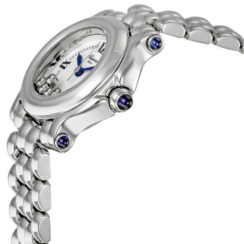 Stainless steel case with a stainless steel bracelet. Fixed stainless steel bezel. White dial with 5 floating diamonds with blue hands. Roman numerals mark the 3, 6, 9 and 12 o'clock positions. Minute markers around an inner ring. Dial Type: Analog. Quartz movement. Scratch resistant sapphire crystal. Blue sapphire cabochon crown. Solid case back. Case size: 26 mm. Case thickness: 8 mm. Round case shape. Band length: 7 inches. Hidden deployment clasp. Water resistant at 30 meters / 100 feet. Functions: hours, minutes, seconds. Dress watch style. Watch label: Swiss Made. Item Variations: 27/8250-23. Chopard Happy Sport Diamond Steel Ladies Watch 27/8250-23.
