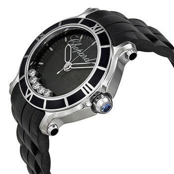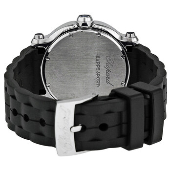 Stainless steel case with a black rubber strap. Fixed stainless steel bezel with a black lacquered inlay. Black guilloche dial with five floating diamonds (0.25 ct) with skeleton hands and index hour markers. Minute markers around the outer rim. Dial Type: Analog. Date display appears between the 4 and 5 o'clock positions. Quartz movement. Scratch resistant sapphire crystal. Push / pull crown set with a blue sapphire. Solid case back. Case diameter: 36 mm. Round case shape. Tang clasp. Water resistant at 30 meters / 100 feet. Functions: date, hour, minute, second. Luxury watch style. Watch label: Swiss Made. Chopard Happy Sport Floating Diamonds Black Dial Ladies Watch 278551-3002.