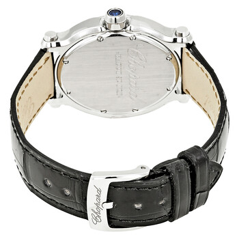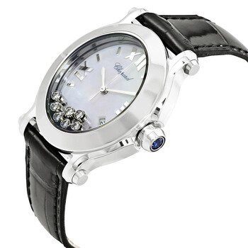 Stainless steel case with a black (alligator) leather strap. Fixed stainless steel bezel. White dial with seven floating diamonds (0.35 ctw) with silver-tone hands and stick hour markers. Roman numerals mark the 3, 6, 9 and 12 o'clock positions. Dial Type: Analog. Date display between the 4 and 5 o'clock positions. Quartz movement. Scratch resistant sapphire crystal. Pull / push sapphire cabochon crown. Solid case back. Case dimensions: 33.6 x 30.75 mm. Case thickness: 10 mm. Oval case shape. Tang clasp. Water resistant at 50 meters / 165 feet. Functions: date, hour, minute, second. Luxury watch style. Watch label: Swiss Made. Item Variations: 278546 3001, 278546.3001, 2785463001. Chopard Happy Sport Floating Diamonds Ladies Watch 278546-3001.