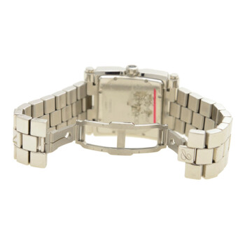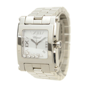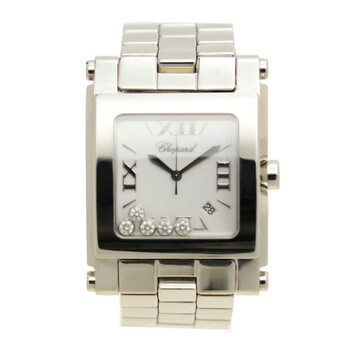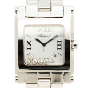 Silver-tone stainless steel case with a silver-tone stainless steel bracelet. Fixed silver-tone stainless steel bezel. White dial with silver-toned hands and index hour markers. Dial Type: Analog. Date display between 4 and 5 o'clock position. Quartz movement. Scratch resistant sapphire crystal. Pull / push crown. Solid case back. Square case shape, case size: 35 mm x 32 mm. Deployment clasp. Water resistant at 30 meters / 100 feet. Functions: date, hour, minute, second. Additional Info: original box, international warranty card, manual (complete accessories). Happy Sport II Series. Luxury watch style. Watch label: Swiss Made. Chopard Happy Sport II Quartz White Dial Ladies Watch 288467-3001.