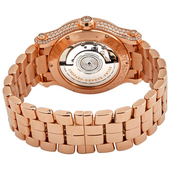 18kt rose gold case with a 18kt rose gold bracelet. Fixed- sapphire set 18kt rose gold bezel. Mother of pearl dial with rose gold hands and index-Roman numerals hour markers. Dial Type: Analog. Scratch resistant sapphire crystal. Round case shape. Case size: 36 mm. Water resistant at 30 meters / 100 feet. Luxury watch style. Watch label: Swiss Made. Chopard Happy Sport Ladies 18kt Rose Gold Watch 274891-5008.