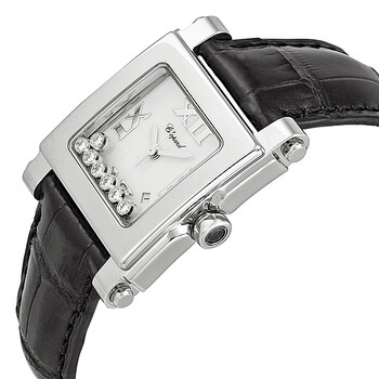 Stainless steel case with a dark blue leather strap. Fixed stainless steel bezel. White dial with 7 floating diamonds and silver-tone hands. Roman numeral mark the 3, 6, 9 and 12 o'clock positions. Dial Type: Analog. Date display at the 4 o'clock position. Quartz movement. Scratch resistant sapphire crystal. Pull / push crown set with a sapphire cabochon. Solid case back. Case diameter: 38 mm. Case thickness: 10 mm. Square case shape. Band width: 16 mm. Deployment clasp. Water resistant at 100 meters/ 330 feet. Functions: hours, minutes, seconds, date. Luxury watch style. Chopard Happy Sport Ladies Watch 278495-3001.