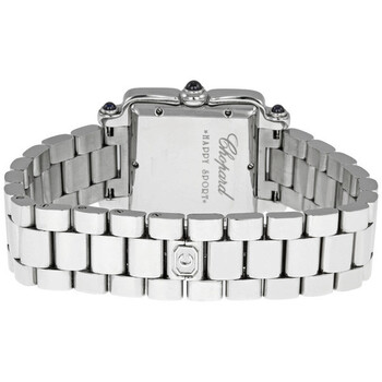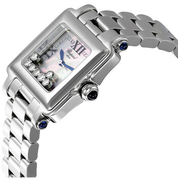 Stainless steel case with a stainless steel bracelet. Fixed stainless steel bezel. Mother of pearl dial with 7 floating diamonds, blue steel hands and Roman numeral hour markers. Minute markers around the outer rim. Date displays at the 6 o'clock position. Quartz movement. Scratch resistant sapphire crystal. Solid case back. Case dimensions: 26 mm x 26 mm. Deployment clasp. Water resistant at 30 meters/ 100 feet. Functions: hours, minutes, seconds, date. Chopard Happy Sport Ladies Watch 2783493006MOP.