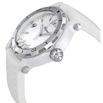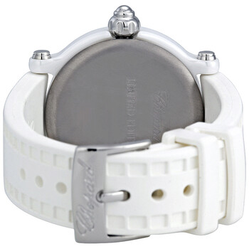 White ceramic case with a white rubber strap. Unidirectional rotating stainless steel bezel. Silver dial with 3 floating diamonds, luminous hands and index hour markers. Arabic numerals mark the 3, 6, 9 and 12 o'clock positions. Minute markers around the outer rim. Dial Type: Analog. Date display appears between the 4 and 5 o'clock positions. Quartz movement. Scratch resistant sapphire crystal. Pull / push crown. Solid case back. Case diameter: 38 mm. Case thickness: 11.8 mm. Round case shape. Tang clasp. Water resistant at 30 meters / 100 feet. Functions: hours, minutes, seconds, date. Dress watch style. Chopard Happy Sport Ladies Watch 288507-9020.