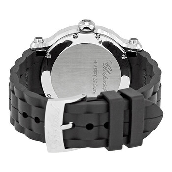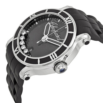 Stainless steel case with a black rubber strap. Fixed stainless steel bezel with a black ceramic top ring. Black textured dial featuring 5 floating diamonds with silver-tone hands and index hour markers. Minute markers around the outer rim. Dial Type: Analog. Date display at the 6 o'clock position. Quartz movement. Scratch resistant sapphire crystal. Stainless steel pull / push crown. Solid case back. Round case shape, case size: 42 mm, case thickness: 12.50 mm. Band width: 22 mm. Tang clasp. Water resistant at 30 meters / 100 feet. Functions: hours, minutes, seconds, calendar. Luxury watch style. Watch label: Swiss Made. Item Variations: 288525 3005, 288525.3005, 2885253005. Chopard Happy Sport Ladies Watch 288525-3005.