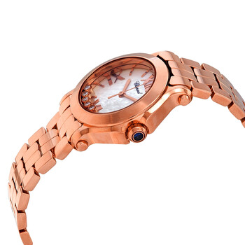 18kt rose gold case with a 18kt rose gold polished bracelet. Fixed bezel. Mother of pearl dial with 5 floating diamonds with rose gold-tone hands and index Roman numeral hour markers. Dial Type: Analog. Quartz movement. Scratch resistant Sapphire crystal. Case diameter: 30 mm. Case thickness: 10 mm. Round case shape. Deployment clasp. Water resistant at 30 meters / 100 feet. Functions: hour, minute, second. Luxury watch style. Watch label: Swiss Made. Chopard Happy Sport Mother Of Pearl Dial 18kt Rose Gold Floating Diamond Ladies Watch 274189-5003.