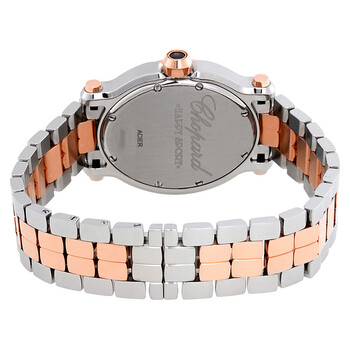Stainless steel case with a stainless steel bracelet with 18kt rose gold center links. Fixed 18kt rose gold bezel set with diamonds. Mother of pearl dial with seven floating diamonds with rose gold-tone hands and stick hour markers. Roman numerals mark the 3, 6, 9 and 12 o'clock positions. Dial Type: Analog. Date display between 4 and 5 o'clock position. Quartz movement. Scratch resistant sapphire crystal. Solid case back. Case size: 33.6 mm x 30.75 mm. Case thickness: 10 mm. Oval case shape. Deployment clasp with a push button release. Water resistant at 50 meters / 165 feet. Functions: date, hour, minute, second. Luxury watch style. Watch label: Swiss Made. Chopard Happy Sport Oval Diamond 18 kt Rose Gold and Stainless Steel Ladies Watch 278546-6004.