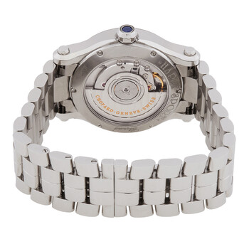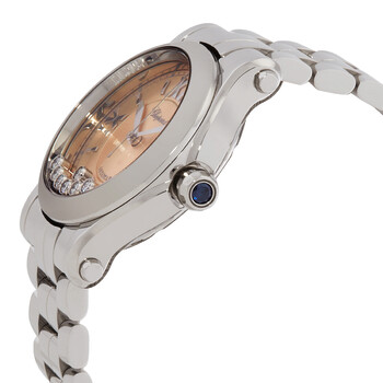 Silver-tone stainless steel case with a brown stainless steel bracelet. Fixed silver-tone stainless steel bezel. Pink dial with silver-tone hands and Roman numeral hour markers. Minute markers around the outer rim. Dial Type: Analog. Date display between 4 and 5 o'clock position. Automatic movement with a 42-hour power reserve. Glareproofed scratch resistant sapphire crystal. Pull / push crown. Transparent case back. Round case shape, case size: 36 mm, case thickness: 12.30 mm. Hidden folding clasp. Water resistant at 30 meters / 100 feet. Functions: date, hour, minute, second. Happy Sport Series. Sport watch style. Watch label: Swiss Made. Chopard Happy Sport Automatic Pink Dial Ladies Watch 278559-3025.