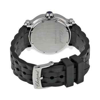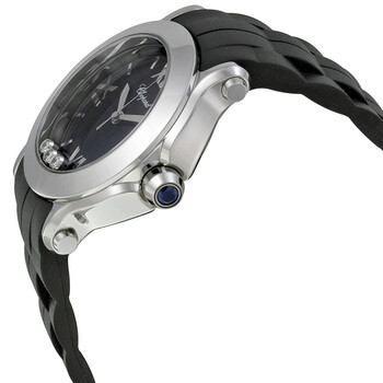 Stainless steel case with a black rubber strap. Fixed stainless steel bezel. Black dial featuring 3 floating diamonds, silve-tone hands and stick hour markers. Roman numerals mark the 3, 6, 9 and 12 o'clock positions. Date displays between the 4 and 5 o'clock positions. Swiss quartz movement. Scratch resistant sapphire crystal crystal. Stainless steel crown with blue sapphire. Stainless steel case back ( engraved and engraveable). Case diameter: 36.0mm. Case thickness: 10.25 mm. Tang clasp. Water resistant at 30 meters/ 100 feet. Functions: hours/ minutes/ seconds/ dare. Chopard Happy Sport Round Ladies Watch 278475-3014.