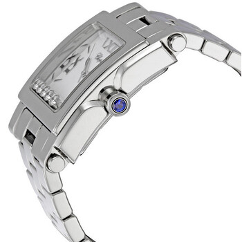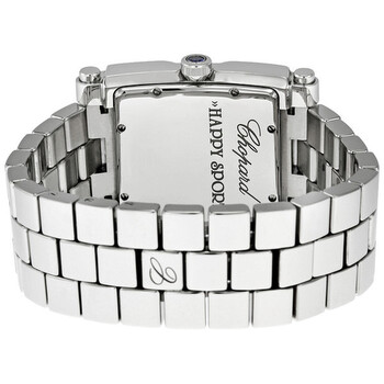 Silver-tone stainless steel case with a silver-tone stainless steel bracelet. Fixed silver-tone stainless steel bezel. White with 5 floating diamonds dial with silver tone hands and silver tone Roman numerals hour markers. Dial Type: Analog. Date display between 4 and 5 o'clock position. Quartz movement. Scratch resistant sapphire crystal. Stainless steel crown. Solid case back. Square case shape, case size: 35.5 mm, case thickness: 11 mm. Band width: 22 mm. Deployment clasp. Water resistant at 30 meters / 100 feet. Functions: hours/ minutes/ seconds/ date. Happy Sport Square Series. Dress watch style. Watch label: Swiss Made. Item Variations: 28/8467-W. Chopard Happy Sport Square Diamond Ladies Watch 28/8467.