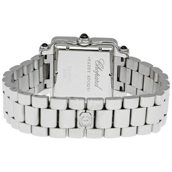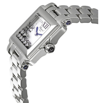 Stainless steel case with a stainless steel bracelet. Fixed stainless steel bezel. White dial with 7 floating diamonds with blue steel hands and Roman numerals marking the 3, 6, 9 and 12 o'clock positions. Minute markers around the outer rim. Date displays at the 6 o'clock position. Quartz movement. Scratch resistant sapphire crystal. Solid case back. Case dimensions: 26 mm x 26 mm. Deployment clasp. Water resistant at 30 meters/ 100 feet. Functions: hours, minutes, seconds. Chopard Happy Sport Square Ladies Watch 278349-3006WHT.