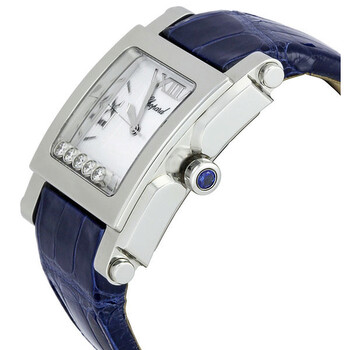 Stainless steel case with a blue (crocodile) leather bracelet. Fixed stainless steel bezel. White dial with 5 floating diamonds (0.50 carats) with silver-tone hands and stick hour markers. Silver-tone roman numerals mark the 3, 6, 9 and 12 o'clock positions. Date displays between the 4 and 5 o'clock positions. Quartz movement. Scratch resistant sapphire crystal. Solid case back. Case diameter: 35.5 mm. Case thickness: 11.50 mm. Tang clasp. Water resistant at 30 meters/100 feet. Functions: hours/ minutes/ seconds/ date. Chopard Happy Sport Stainless Steel Ladies Watch 288447-3001.