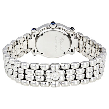 Stainless steel case with a stainless steel bracelet. Fixed stainless steel bezel set with diamonds. White dial (with 5 sapphire cabochons) with blue hands and index hour markers. Roman numerals appear at the 3, 6, 9 and 12 o'clock positions. minute markers. Dial Type: Analog. Quartz movement. Scratch resistant sapphire crystal. Blue sapphire cabochon crown. Solid case back. Case size: 26 mm. Case thickness: 8 mm. Round case shape. Band length: 7 inches. Hidden deployment clasp. Water resistant at 30 meters / 100 feet. Functions: hours/ minutes/ seconds. Additional Info: 5 sapphire cabochons. withstands rain and splashes of water, but not showering or submersion. Luxury watch style. Watch label: Swiss Made. Item Variations: 27/8294-23. Chopard Happy Sport Stainless Steel Ladies Watch 27/8294-23.