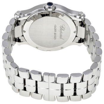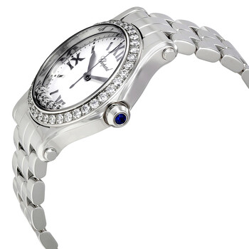 Stainless steel case with a stainless steel bracelet. Fixed stainless steel diamond-set bezel. White matte dial featuring 5 floating diamonds with silver-tone hands and index hour markers. Roman numerals mark the 3, 6, 9 and 12 o'clock positions. minute markers around the outer rim. Dial Type: Analog. Date display between the 4 and 5 o'clock positions. Quartz movement. Scratch resistant sapphire crystal. Pull / push crown. Solid case back. Case size: 36 mm. Round case shape. Fold over clasp. Water resistant at 30 meters / 100 feet. Functions: date, hour, minute, second. Dress watch style. Watch label: Swiss Made. Chopard Happy Sport White Dial Ladies Watch 278582-3004.