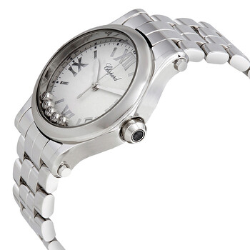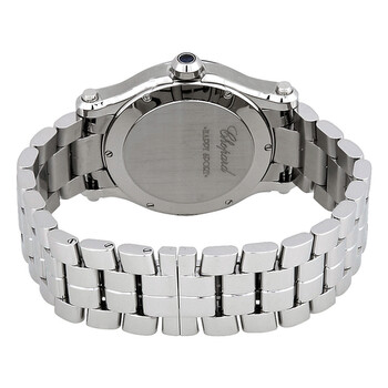 Stainless steel case with a stainless steel bracelet. Fixed stainless steel bezel. White matte dial (with 5 floating diamonds) with silver-tone hands and index hour markers. Arabic numerals mark the 3, 6, 9 and 12 o'clock positions. Minute markers around the outer rim. Dial Type: Analog. Date display between the 4 and 5 o'clock positions. Quartz movement. Scratch resistant sapphire crystal. Pull / push crown. Solid case back. Round case shape. Case size: 36 mm. Case thickness: 12.3 mm. Hidden fold over clasp. Water resistant at 30 meters / 100 feet. Functions: date, hour, minute, second. Additional Info: crown set with blue sapphire. Happy Sport Series. Dress watch style. Watch label: Swiss Made. Chopard Happy Sport White Matte Dial Ladies Watch 278582-3002.