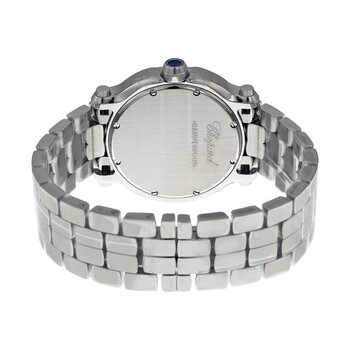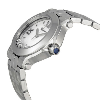 Stainless steel case with a stainless steel bracelet. Fixed stainless steel bezel. White dial (with three floating diamonds) with silver-tone hands and index hour markers. Roman numerals mark the 3, 6, 9 and 12 o'clock positions. Dial Type: Analog. Date display between the 4 and 5 o'clock positions. Quartz movement. Scratch resistant sapphire crystal. Pull / push crown. Solid case back. Case diameter: 36 mm. Case thickness: 11 mm. Round case shape. Band width: 18 mm. Band length: 7 inches. Hidden fold over clasp. Water resistant at 30 meters / 100 feet. Functions: hour, minute, second, date. Luxury watch style. Chopard Happy Sport White with Diamonds Dial Ladies Watch 278477-3013.