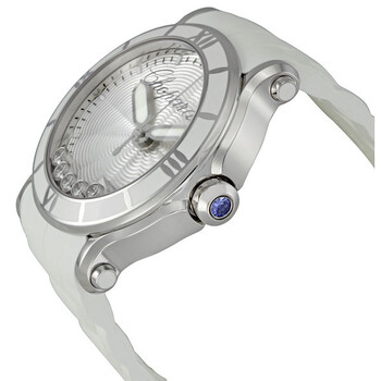 Silver-tone stainless steel case with a white rubber strap. Fixed white ceramic bezel. Silver dial with 5 floating diamonds dial with luminous hands and index hour markers. Minute markers around the outer rim. Dial Type: Analog. Luminescent hands. Date display at the 6 o'clock position. Quartz movement. Scratch resistant sapphire crystal. Steel set with a sapphire cabochon crown. Solid case back. Round case shape, case size: 42 mm, case thickness: 12.5 mm. Band width: 22 mm. Tang clasp. Water resistant at 30 meters / 100 feet. Functions: hours, minutes, seconds, calendar. Additional Info: 5 floating diamonds weighing approx. 0.50 ctw. Happy Sport Xl Series. Luxury watch style. Watch label: Swiss Made. Item Variations: 288525 3002, 288525.3002, 2885253002. Chopard Happy Sport XL Ladies Watch 288525-3002.