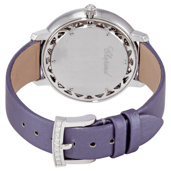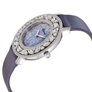 18kt white gold case with a blue satin (leather back) strap. Fixed 18kt white gold bezel set with diamonds. Blue mother of pearl dial with silver-tone hands and diamond hour markers. Dial Type: Analog. Quartz movement. Scratch resistant sapphire crystal. Pull / push crown. Solid case back. Round case shape. Case size: 36 mm. Case thickness: 9.3 mm. Tang clasp. Water resistant at 50 meters / 165 feet. Functions: hour, minute. Heure Du Diamant Series. Luxury watch style. Watch label: Swiss Made. Chopard Heure du Diamant Quartz Diamond Mother of Pearl Dial Ladies Watch 139423-1502.