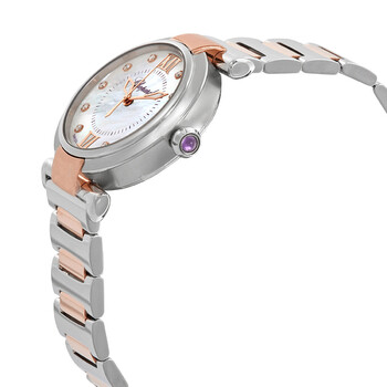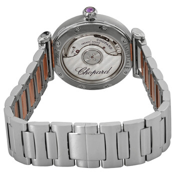 Stainless steel case with a stainless steel bracelet with 18k rose gold links. Fixed stainless steel bezel. Mother of pearl dial with rose gold-tone skeleton hands and diamond hour markers. Roman numerals appear at the 6 and 12 o'clock positions. Minute markers around an inner ring. Dial Type: Analog. Chopard calibre 09.01-C automatic movement, containing 27 Jewels, bitting at 25200 vph, and has a power reserve of approximately 42 hours. Scratch resistant sapphire crystal. Pull / push crown. Transparent case back. Round case shape. Case size: 29 mm. Case thickness: 8.7 mm. Fold over clasp with a push button release. Water resistant at 50 meters / 150 feet. Functions: hour, minute, second. Imperiale Series. Luxury watch style. Watch label: Swiss Made. Chopard Imperiale Automatic Diamond Ladies Watch 388563-6014.