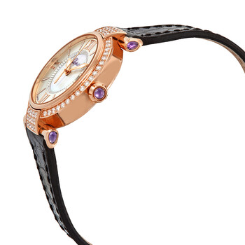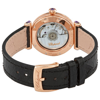 18kt rose gold case with a black (glossy alligator) leather strap. Fixed 18kt rose gold bezel set with diamonds. Mother of pearl dial with luminous rose gold-tone hands and index hour markers. Roman numerals appear at the 3, 6, 9 and 12 o'clock positions. Minute markers around an inner ring. Dial Type: Analog. Date display at the 3 o'clock position. Automatic movement. Scratch resistant sapphire crystal. Pull / push crown. Transparent case back. Round case shape. Case size: 29 mm. Case thickness: 9 mm. Band width: 15 mm / 14 mm. Tang clasp. Water resistant at 50 meters / 165 feet. Functions: date, hour, minute, second. Imperiale Series. Luxury watch style. Watch label: Swiss Made. Chopard Imperiale Automatic Diamond Mother of Pearl Dial Ladies Watch 384319-5003.