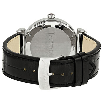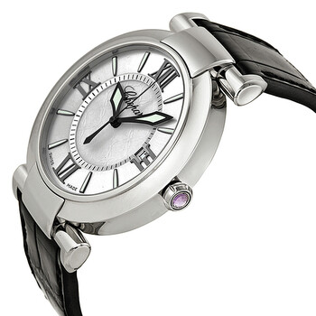 Stainless steel case with a black leather strap. Fixed stainless steel bezel. Silver dial with luminous black hands and index hour markers. Roman numerals mark the 3, 6, 9 and 12 o'clock positions. Minute markers around the inner ring. Dial Type: Analog. Luminescent hands and markers. Date display at the 3 o'clock position. Sellita calibre SW300 automatic movement with a 42-hour power reserve. Scratch resistant sapphire crystal. Amethyst cabochon crown. Solid case back. Case size: 40 mm. Case thickness: 9.35 mm. Round case shape. Band width: 20 mm. Tang clasp. Water resistant at 50 meters / 165 feet. Functions: date, hour, minute, second. Luxury watch style. Watch label: Swiss Made. Item Variations: 388531 3001, 388531.3001, 3885313001. Chopard Imperiale Automatic Silver Dial Unisex Watch 388531-3001.