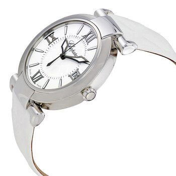 Stainless steel case with a white (calfskin) leather strap. Fixed stainless steel bezel. White dial with luminous black hands and index hour markers. Roman numerals mark the 3, 6, 9 and 12 o'clock positions. Minute markers around an inner ring. Dial Type: Analog. Luminescent hands and markers. Date display at the 3 o'clock position. Chopard calibre 01.01-C automatic movement with a 60-hour power reserve. Scratch resistant sapphire crystal. Pull / push crown. Transparent case back. Case size: 40 mm. Case thickness: 10 mm. Round case shape. Band width: 20 mm. Tang clasp. Water resistant at 50 meters / 165 feet. Functions: date, hour, minute, second. Luxury watch style. Watch label: Swiss Made. Item Variations: CP388531 3007, CP388531.3007, CP3885313007. Chopard Imperiale Automatic Ladies Watch 388531-3007.