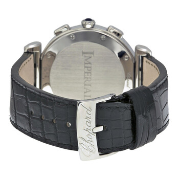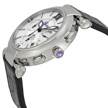Stainless steel case with a black leather strap. Fixed stainless steel bezel. Silver outer (mother of pearl center) dial with luminous hands and index hour markers. A Roman numeral marks the 12 o'clock position. Minute markers around an inner ring. Dial Type: Analog. Luminescent hands and markers. Date display between the 4 and 5 o'clock positions. Chronograph - three sub-dials displaying: 60 second, 30 minute and 12 hour. Frederic Piguet caliber 1185 automatic movement, containing 37 Jewels, composed of 304 parts, bitting at 21600 vph, and has a power reserve of approximately 48 hours. Scratch resistant sapphire crystal. Push / pull set with a amethyst crown. Solid case back. Round case shape. Case size: 40 mm. Case thickness: 11 mm. Band width: 20 mm. Band length: 8 inches. Tang clasp. Water resistant at 50 meters / 165 feet. Functions: chronograph, date, hour, minute, second. Imperiale Series. Luxury watch style. Watch label: Swiss Made. Chopard Imperiale Chronograph Automatic Silver Dial Stainless Steel Men's Leather Strap Watch 388549-3001.