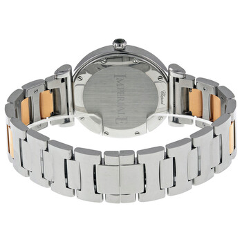 Stainless steel case with a stainless steel bracelet with 18kt rose gold links. Fixed stainless steel bezel. Green dial with luminous hands and index hour markers. Roman numerals mark the 3, 6, 9 and 12 o'clock positions. Minute markers around an inner ring. Dial Type: Analog. Date display at the 3 o'clock position. Quartz movement. Scratch resistant sapphire crystal. Pull / push crown. Solid case back. Case diameter: 36 mm. Case thickness: 9 mm. Round case shape. Band width: 22 mm. Hidden fold over clasp. Water resistant at 50 meters / 165 feet. Functions: date, hour, minute, second. Luxury watch style. Watch label: Swiss Made. Item Variations: 388532 6007, 388532.6007, 3885326007. Chopard Imperiale Green Dial Stainless Steel and 18kt Rose Gold Ladies Watch 388532-6007.