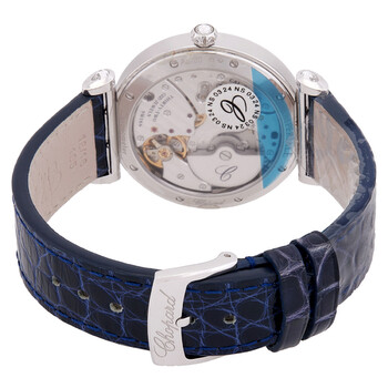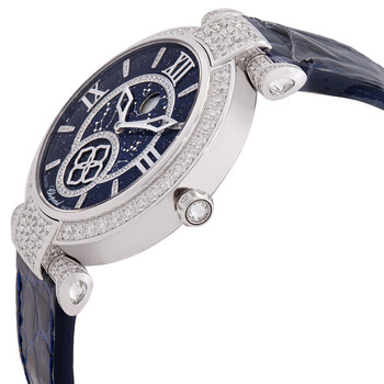 18kt white gold case with a blue alligator leather strap. Fixed 18kt white gold bezel set with diamonds. Blue aventurine dial with silver-tone hands and diamond-Roman numeral hour markers. Dial Type: Analog. Automatic movement. Scratch resistant sapphire crystal. Pull / push crown. Transparent see through case back. Round case shape, case size: 36 mm, case thickness: 9.84 mm. Buckle clasp. Water resistant at 50 meters / 165 feet. Functions: hour, minute, small second. Imperiale Moonphas Series. Luxury watch style. Watch label: Swiss Made. Chopard Imperiale Moonphas Automatic Diamond Ladies Watch 384246-1002.