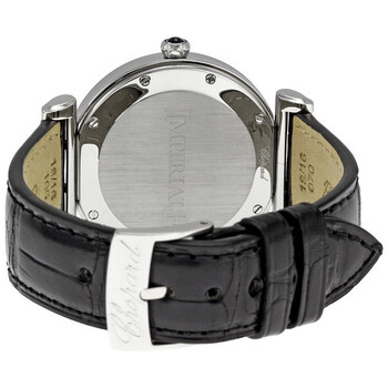 Stainless steel case with a black (croco-embossed) leather strap. Fixed stainless steel bezel. Silver mother od pearl dial with luminous balck hands and index hour markers. Black Roman numerals mark the 3, 6, 9 and 12 o'clock positions. Minute markers around an inner ring. Luminescent hands and markers. Date display at the 3 o'clock position. Quartz movement. Scratch resistant sapphire crystal. Steel crown set with single amethyst cabochon. Solid case back. Case diameter: 36 mm. Case thickness: 9 mm. Tang clasp. Water resistant at 50 meters / 165 feet. Functions: hours, minutes, center seconds, date. Chopard Imperiale Mother of Pearl Dial Ladies Watch 388532-3001.