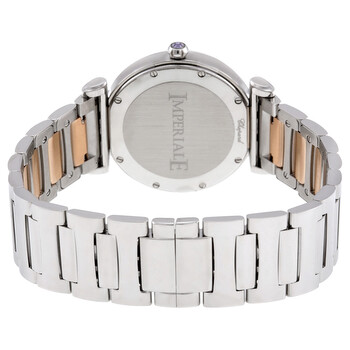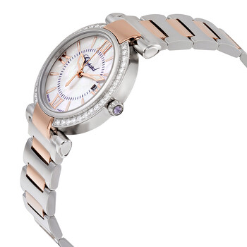 Stainless steel case with a stainless steel bracelet with 18kt rose gold links. Fixed stainless steel bezel set with diamonds. Mother of pearl dial with luminous rose gold-tone hands and index hour markers. Roman numerals mark the 3, 6, 9 and 12 o'clock positions. Minute markers around an inner ring. Dial Type: Analog. Luminescent hands and markers. Date display at the 3 o'clock position. Quartz movement. Scratch resistant sapphire crystal. Pull / push crown. Solid case back. Case diameter: 28 mm. Case thickness: 9 mm. Round case shape. Band width: 17.8 mm. Band length: 7 inches. Hidden fold over clasp. Water resistant at 50 meters / 165 feet. Functions: date, hour, minute, second. Luxury watch style. Watch label: Swiss Made. Item Variations: 388541 6004, 388541.6004, 3885416004. Chopard Imperiale Mother of Pearl Dial Steel and 18kt Rose Gold Ladies Watch 388541-6004.