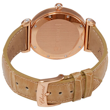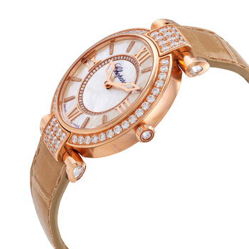 18kt rose gold case with a brown leather strap. Fixed 18kt rose gold set with 58 diamonds bezel. Mother of pearl (diamond-set) dial with rose gold-tone skeleton hands and diamond-set index hour markers. Roman numerals appear at the 3, 6, 9 and 12 o'clock positions. Dial Type: Analog. Automatic movement with a 42-hour power reserve. Scratch resistant sapphire crystal. Pull / push crown. Solid case back. Round case shape, case size: 36 mm, case thickness: 9 mm. Tang clasp. Water resistant at 50 meters / 165 feet. Functions: hour, minute, second. Sport watch style. Watch label: Swiss Made. Chopard Imperiale Mother of Pearl with Diamonds Dial Ladies Watch 384242-5005.