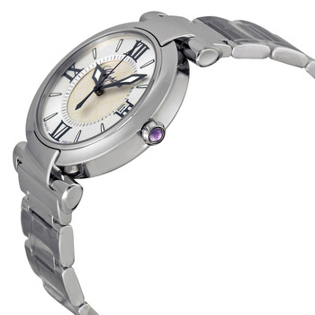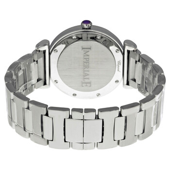 Stainless steel case with a stainless steel bracelet. Fixed stainless steel bezel. Silver dial with luminous hands and index hour markers. Roman numerals mark the 3, 6, 9, and 12 o'clock position. Dial Type: analog. Date display appears at the 3 o'clock position. Quartz movement. Scratch resistant sapphire crystal. Lotus shaped crown embedded with a gemstone. Solid case back. Case diameter: 36 mm. Case thickness: 9 mm. Bracelet width: 18 mm. Fold over clasp. Water resistant at 50 meters/ 165 feet. Functions: hours, minutes, seconds, date. Luxury Dress watch style. Chopard Imperiale Ladies Watch 388532-3002.