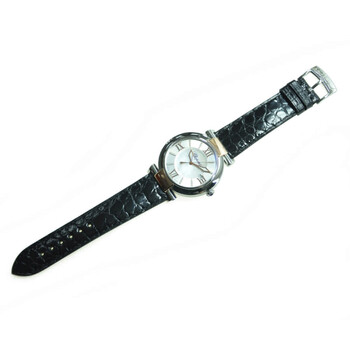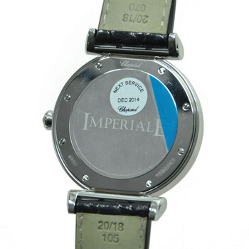 Polished 18kt rose gold and stainless steel case with a black crocodile leather strap. Fixed bezel. Silver dial with luminous gold-tone hands and index hour markers. Minute markers around the inner ring. Dial Type: Analog. Date display at the 3 o'clock position. Automatic movement. Scratch resistant sapphire crystal. Pull / push crown. Solid case back. Case diameter: 40 mm. Case thickness: 9.35 mm. Round case shape. Tang clasp. Water resistant at 50 meters / 165 feet. Functions: date, hour, minute, second. Luxury watch style. Watch label: Swiss Made. Chopard Imperiale Silver Dial Steel and Rose Gold Case Leather Ladies Watch 388531-6001.