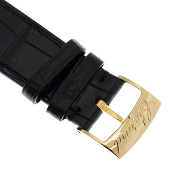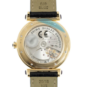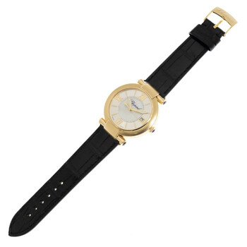 Polished 18 carat yellow gold case with a black leather strap. Fixed 18k yellow gold bezel. Silver mother of pearl dial with gold-tone hands and Roman numeral hour markers. Dial Type: Analog. Luminescent hands and markers. Date display at the 3 o'clock position. Chopard Calibre FE 001 Automatic movement, containing 31 Jewels, bitting at 28800 vph, and has a power reserve of approximately 38 hours. Scratch resistant sapphire crystal. Pull / push crown. Skeleton transparent exhibition see through case back. Round case shape, case size: 40 mm, case thickness: 11 mm. Tang clasp. Water resistant at 50 meters / 165 feet. Functions: date, hour, minute. Imperiale Series. Luxury watch style. Watch label: Swiss Made. Item Variations: 384241 0001, 384241.0001, 3842410001. Chopard Imperiale Silver Mother of Pearl Dial Ladies Watch 384241-0001.