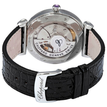 Stainless steel case with a black (alligator) leather strap. Rose gold lugs. Fixed stainless steel bezel. Silver mother of pearl dial with luminous rose gold hands and index hour markers. Roman numerals appear at the 3, 6, 9 and 12 o'clock positions. Minute markers around an inner ring. Dial Type: Analog. Luminescent hands and markers. Date display at the 3 o'clock position. Chopard calibre 01.01-C automatic movement, containing 40 Jewels, composed of 207 parts, bitting at 28800 vph, and has a power reserve of approximately 60 hours. Scratch resistant sapphire crystal. Pull / push crown. Transparent case back. Round case shape. Case size: 40 mm. Case thickness: 9.35 mm. Tang clasp. Water resistant at 50 meters / 165 feet. Functions: date, hour, minute, second, chronometer. Imperiale Series. Luxury watch style. Watch label: Swiss Made. Item Variations: 388531 6005, 388531.6005, 3885316005. Chopard Imperiale Silver Mother of Pearl Dial Men's Watch 388531-6005.