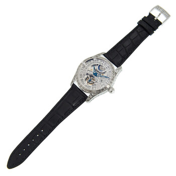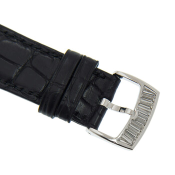 18kt white gold case with a black alligator band. Fixed bezel with diamond set. Silver-tone dial with index-Roman numeral hour markers. Dial Type: Analog. Chopard Calibre L.U.C 02.01-L hand wind movement with a 216-hour power reserve. Scratch resistant sapphire crystal. Screw down crown. Transparent see through case back. Round case shape, case size: 43 mm, case thickness: 12.50. Tang clasp. Water resistant at 30 meters / 100 feet. Functions: hour, minute, second, tourbillon. L.u.c Quattro Tourbillon Series. Luxury watch style. Watch label: Swiss Made. Item Variations: Limited to 25. Chopard L.U.C Quattro Tourbillon Hand Wind Diamond Silver Dial Men's Watch 171921-1001.