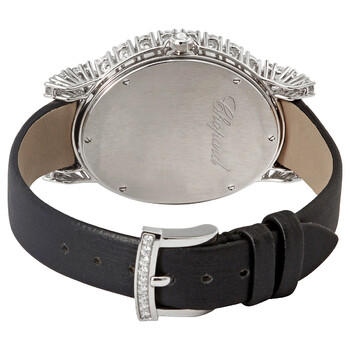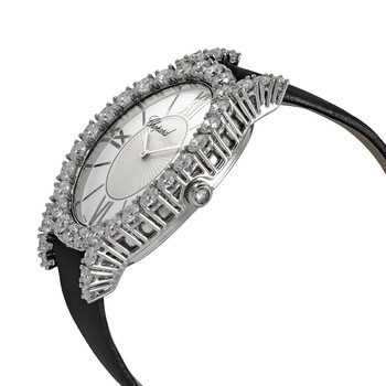 18kt white gold case with a black leather strap. Fixed 18kt white gold bezel set with diamonds. White (mother of pearl) dial with white gold hands and index hour markers. Roman numeral markers appear at the 3, 6, 9 and 12 o'clock positions. Dial Type: Analog. Quartz movement. Scratch resistant sapphire crystal. Pull / push crown. Solid case back. Oval case shape. Case dimensions: 40 mm x 34.1 mm. Tang clasp. Water resistant at 30 meters / 100 feet. Functions: hour, minute. Additional Info: total carat weight: 7.13ct. L'heure Du Diamant Series. Luxury watch style. Watch label: Swiss Made. Chopard LHeure du Diamant 18kt White Gold Quartz Ladies Watch 139383-1004.