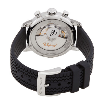 Silver-tone stainless steel case with a black rubber strap. Fixed silver-tone stainless steel bezel. Black dial with silver-tone hands and Arabic numeral hour markers. Minute markers around the outer rim. Dial Type: Analog. Luminescent hands and markers. Date display between 4 and 5 o'clock position. Chronograph - three sub-dials displaying: 60 second, 30 minute and 12 hour. Automatic movement. Scratch resistant sapphire crystal. Screw down crown. Transparent see through case back. Round case shape, case size: 40 mm. Buckle clasp. Water resistant at 50 meters / 165 feet. Functions: chronograph, date, hour, minute, second. Additional Info: original box, international warranty card, manual (complete accessories). Mille Miglia Series. Luxury watch style. Watch label: Swiss Made. Chopard Mille Miglia Chronograph Automatic Black Dial Men's Watch 168619-3001.