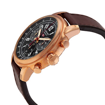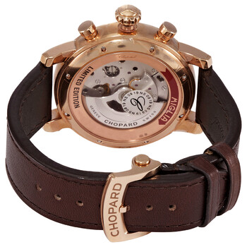 18kt rose gold case with a brown (calfskin) leather strap. Fixed 18kt rose gold bezel. Black dial with luminous rose gold-tone hands and Arabic numeral hour markers. Arabic numeral minute markers (at 5 minute intervals). Minute markers. Tachymeter markings around the outer rim. Dial Type: Analog. Luminescent hands and markers. Date display between the 4 and 5 o'clock positions. Chronograph - three sub-dials displaying: 60 second, 30 minute and 12 hour. Chopard calibre 03.05-C automatic movement, containing 45 Jewels, bitting at 28800 vph, and has a power reserve of approximately 60 hours. Scratch resistant sapphire crystal. Transparent case back. Round case shape. Case size: 46 mm. Fold over clasp with a safety release. Water resistant at 50 meters / 165 feet. Functions: chronograph, tachymeter, flyback, date, hour, minute, small second. Mille Miglia Series. Luxury watch style. Watch label: Swiss Made. Chopard Mille Miglia Chronograph Automatic Black Dial Men's Watch 161297-5001.