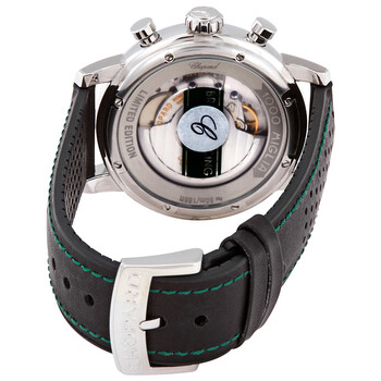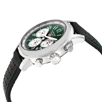 Silver-tone stainless steel case with a black calfskin leather perforated (matt) strap. Green dial with silver-tone hands and Arabic numeral hour markers. Tachymeter. Dial Type: Analog. Luminescent hands and markers. Date display between 4 and 5 o'clock position. Chronograph - three sub-dials displaying: 60 second, 30 minute and 12 hours. Automatic movement with a 42-hour power reserve. Scratch resistant sapphire crystal. Screw down crown. Transparent case back. Round case shape, case size: 42 mm, case thickness: 12.67 mm. Water resistant at 50 meters / 165 feet. Functions: chronograph, date, hour, minute, second. Additional Info: limited edition. Luxury watch style. Watch label: Swiss Made. Chopard Mille Miglia Chronograph Automatic Green Dial Men's Watch 168589-3009.