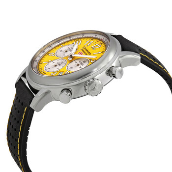 Stainless steel case with a black (perforated calfskin) leather strap. Fixed stainless steel bezel. Yellow dial with luminous silver-tone hands and Arabic numeral hour markers. Minute markers. Tachymeter markers around the outer rim. Dial Type: Analog. Luminescent hands and markers. Date display between the 4 and 5 o'clock positions. Chronograph - three white sub-dials displaying: 60 second, 30 minute and 12 hour. Automatic movement with a 42-hour power reserve. Scratch resistant sapphire crystal. Screw down crown. Transparent case back. Round case shape. Case size: 42 mm. Case thickness: 12.67 mm. Band width: 20 mm. Tang clasp. Water resistant at 50 meters / 165 feet. Functions: chronograph, tachymeter, date, hour, minute, second. Additional Info: limited to 300 pieces. Mille Miglia Series. Luxury watch style. Watch label: Swiss Made. Chopard Mille Miglia Chronograph Automatic Men's Limited Edition Watch 168589-3011.