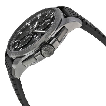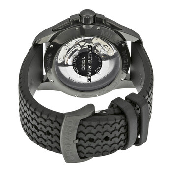 Black DLC stainless steel case with a black rubber strap. Fixed black DLC bezel showing engraved tachymeter markings. Black carbon fiber dial with luminous hands and index hour markers. Arabic numeral minute markers (at 5 minute intervals). Minute markers around the outer rim. Dial Type: Analog. Luminescent hands and markers. Magnified date display at the 3 o'clock position. Chronograph - three sub-dials displaying: 60 second, 30 minute and 12 hour. ETA-Valgranges caliber A07.211 automatic movement, based upon ETA 7750, containing 25 Jewels, bitting at 28800 vph, and has a power reserve of approximately 46 hours. Scratch resistant sapphire crystal. Screw locked crown. Skeleton case back. Round case shape. Case size: 44 mm. Case thickness: 14.36 mm. Band width: 22 mm. Fold over tang clasp. Water resistant at 100 meters / 330 feet. Functions: chronograph, date, hour, minute, small second, chronometer, tachymeter. Mille Miglia Gt Xl Chrono Series. Sport watch style. Watch label: Swiss Made. Chopard Mille Miglia Chronograph Black Carbon Fiber Dial Men's Watch 168459-3022.
