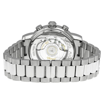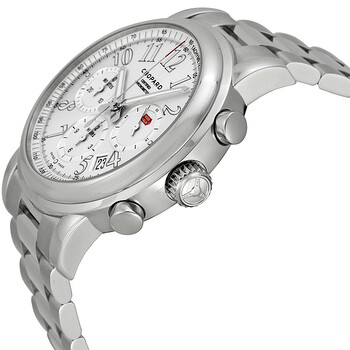 Stainless steel case with a stainless steel bracelet. Fixed stainless steel bezel. Silver dial with luminous silver-tone hands and Arabic numeral hour markers. Minute markers. Tachymeter around the outer rim. Dial Type: Analog. Luminescent hands and markers. Date display between 4 and 5 o'clock positions. Chronograph - three sub-dials displaying: 60 second, 30 minute and 12 hour. Automatic movement with a 42 hour power reserve. Scratch resistant sapphire crystal. Pull / push crown. Skeleton case back. Case diameter: 42 mm. Case thickness: 12.3 mm. Round case shape. Band width: 18 mm. Band length: 7.75 inches. Hidden deployment clasp. Water resistant at 50 meters / 165 feet. Dress watch style. Chopard Mille Miglia Chronograph Mechanical Silver Dial Stainless Men's Watch 158511-3001.