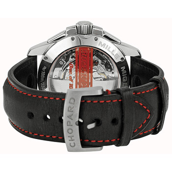 Grey titanium case with a black leather strap. Fixed grey titanium bezel with engraved tachymeter markings. Red dial with luminous silver-tone hands and index hour markers. Arabic numeral minute markers (at 5 minute intervals). Minute markers around the outer rim. Dial Type: Analog. Luminescent hands and markers. Date display at the 3 o'clock position. Chronograph - three sub-dials displaying: 60 second, 30 minute and 12 hour. ETA-Valgranges caliber A07.211 automatic movement, based upon ETA 7750, containing 25 Jewels, bitting at 28800 vph, and has a power reserve of approximately 46 hours. Scratch resistant sapphire crystal with engraved Arabic numerals at the 6 and 12 o'clock positions. Screw down crown. Transparent case back. Round case shape. Case size: 44 mm. Case thickness: 14.36 mm. Band width: 23 mm. Band length: 8 inches. Tang clasp. Water resistant at 100 meters / 330 feet. Functions: chronograph, date, hour, minute, small second, chronometer, tachymeter. Additional Info: limited edition to 1000 pieces world-wide (not numbered). Mille Miglia Gt Xl Chrono Rosso Corsa Series. Luxury watch style. Watch label: Swiss Made. Item Variations: 168459 3036, 168459.3036, 1684593036. Chopard Mille Miglia Gran Turismo Chronograph Automatic Men's Watch 168459-3036.